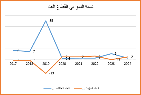 أما في المقابل، فقد شهد نمو التوظيف تراجعًا حادًا؛ فبين عامي 2020 و2022 تراوح بين 2% و3%، لكنه انخفض إلى -0.5% في عام 2023، مما يؤكد استمرار تقليص حجم القطاع العام. (انظر: الرسم البياني رقم 2).